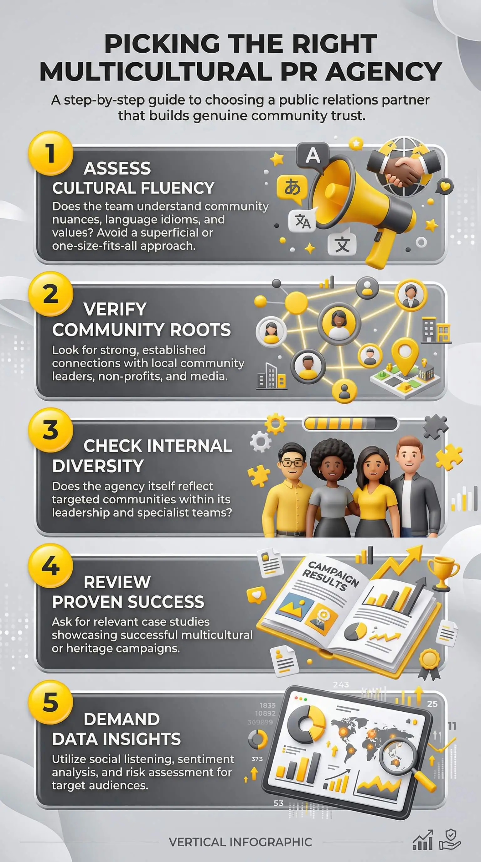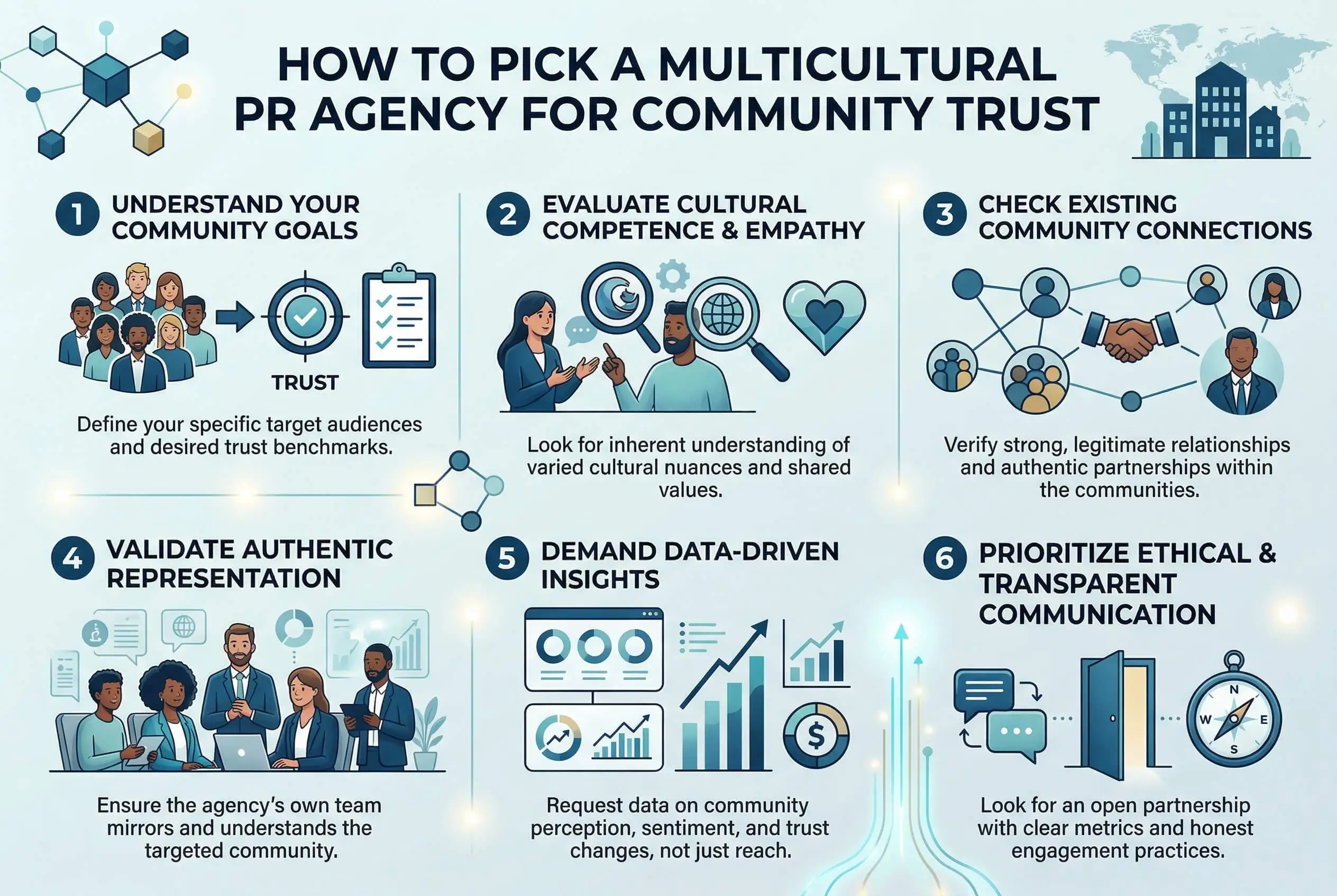 Ask: What percentage of your team is from the communities we are targeting? Can you share a case study with specific community outcomes and metrics? Have you managed a multicultural PR crisis — and what happened? Who are your relationships with in our target community — and how were those relationships built? How do you measure community trust and cultural engagement? The answers will separate authentic agencies from those with polished presentations.